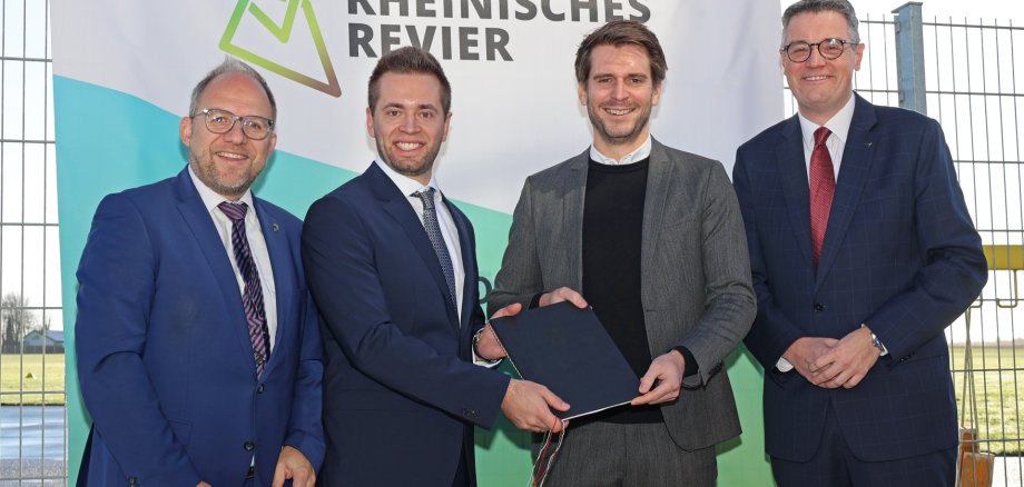 Staatssekretär Paul Höller (2.v.r.) vom Ministerium für Wirtschaft, Industrie, Klimaschutz und Energie des Landes NRW hat einen wichtigen Förderbescheid für den Aero-Park in Merzbrück übergeben. Es freuen sich (von links:) Würselens Bürgermeister Roger Nießen, der Geschäftsführer der Aachener Kreuz Merzbrück GmbH & Co. KG, Marvin Kouchen, und Städteregionsrat Dr. Tim Grüttemeier.