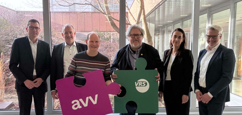 Das Foto zeigt v.l. AVV-Geschäftsführer Hans-Peter Geulen, Joachim Adler, Bereichsleiter Finanzen und Vertrieb ASEAG, den Vorsitzenden der AVV-Verbandsversammlung, Wilfried Fischer, den Vorsitzenden der VRS-Verbandsversammlung, Bernd Kolvenbach, Anja Höhn, Beiratsvorstands-Mitglied VRS, sowie VRS-Geschäftsführer Michael Vogel.