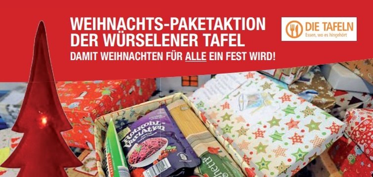 Die Würselener Tafel ruft zur Weihnachtspaket-Aktion auf: Pakete mit haltbaren Lebensmitteln und einem kleinen Weihnachtsgruß kann man am Mittwoch, 10. Dezember, von 10 Uhr bis 19 Uhr im Jugendzentrum St. Sebastian, Wilhelmstraße 7, abgeben.