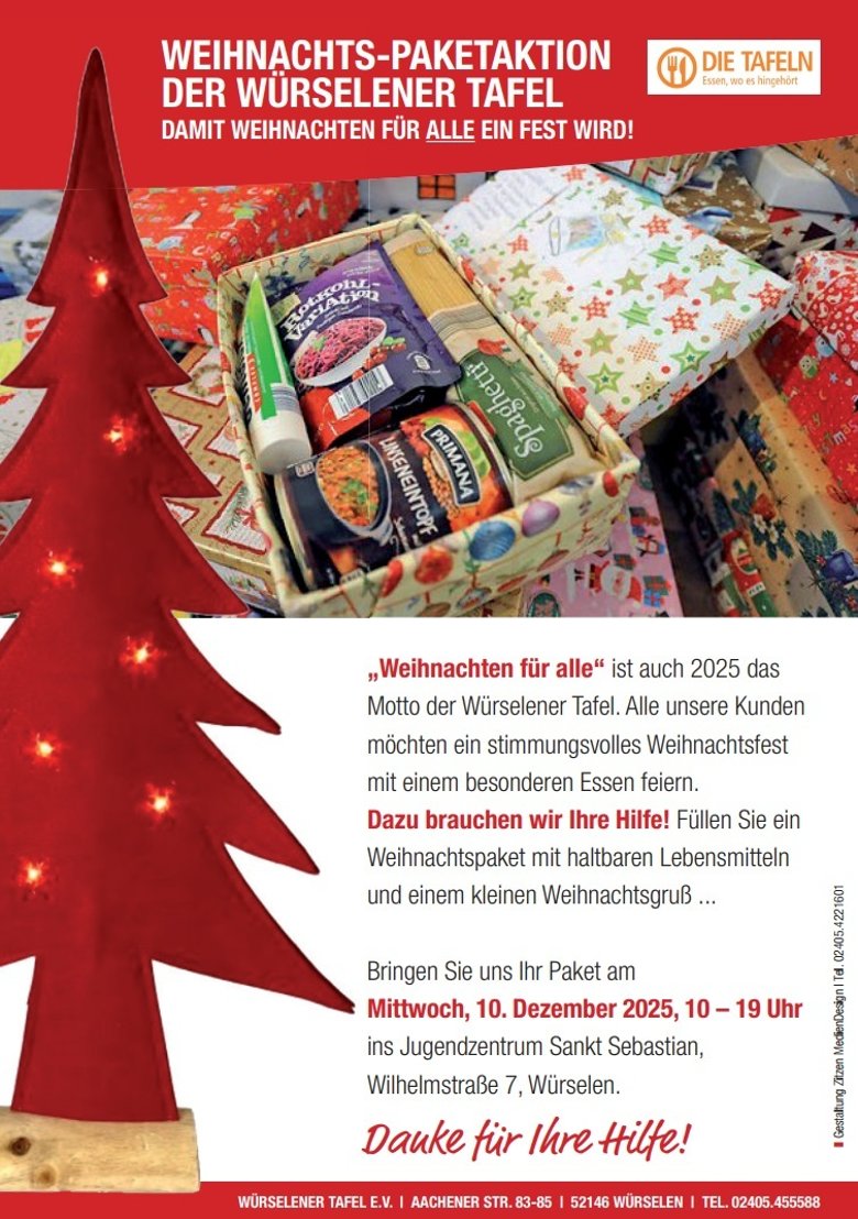 Die Würselener Tafel ruft zur Weihnachtspaket-Aktion auf: Pakete mit haltbaren Lebensmitteln und einem kleinen Weihnachtsgruß kann man am Mittwoch, 10. Dezember, von 10 Uhr bis 19 Uhr im Jugendzentrum St. Sebastian, Wilhelmstraße 7, abgeben.