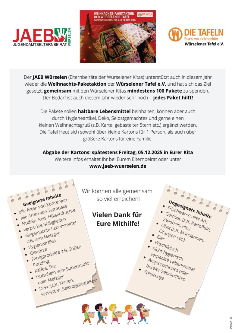 In den Würselener Kitas können die Pakete bis 5. Dezember abgegeben werden. Dadurch unterstützt der JAEB die Paketaktion und hat sich zum Ziel gesetzt, mindestens 100 Pakete in den Kitas zu sammeln: