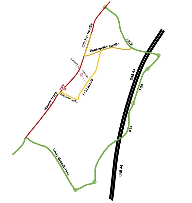 Eine Behelfsumleitung für die Anlieger erfolgt von der Hauptstraße in Fahrtrichtung Alsdorf über die Friedhofstraße bis Feldstraße/Buschstraße. Hierzu sind rechtsseitig Haltverbote erforderlich. Alle anderen Verkehrsteilnehmer werden gebeten, die weiträumige Umleitung über die K30, K34, L223 (siehe oben) zu nutzen.