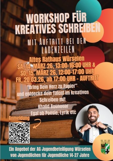 Du hast Lust, deine Ideen in Worte zu verwandeln und auf die Bühne zu bringen? In unserem Workshop entdeckst du kreatives Schreiben, lernst systematische Kreativität kennen und bekommst spannende Einblicke in verschiedene Vortragsweisen – inklusive Tipps zur Verwertung deiner Texte, egal ob Poesie, Lyrik oder anderes. Gemeinsam bereiten wir eine starke Performance vor, die zu dir passt. Highlight zum Schluss: ein echter Auftritt bei den „LadenZeilen“ in Würselen, auf den du Schritt für Schritt vorbereitet wirst.