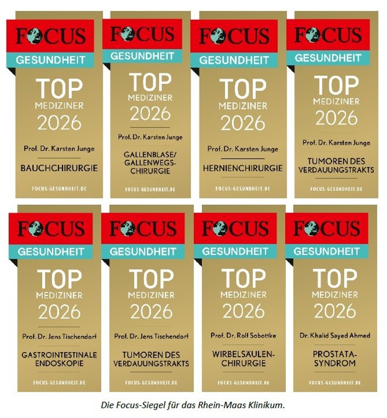 Die vier Chefärzte Prof. Dr. med. Karsten Junge (Allgemein-, Viszeral- und Minimalinvasive Chirurgie), Prof. Dr. med. Jens Tischendorf (Innere Medizin und Gastroenterologie), Prof. Dr. med. Rolf Sobottke (Wirbelsäulenchirurgie, Neurochirurgie und Spezielle Orthopädie) und Dr. med. Khalid Sayed Ahmed (Urologie und Kinderurologie) wurden vom Focus als Top-Mediziner ausgezeichnet.