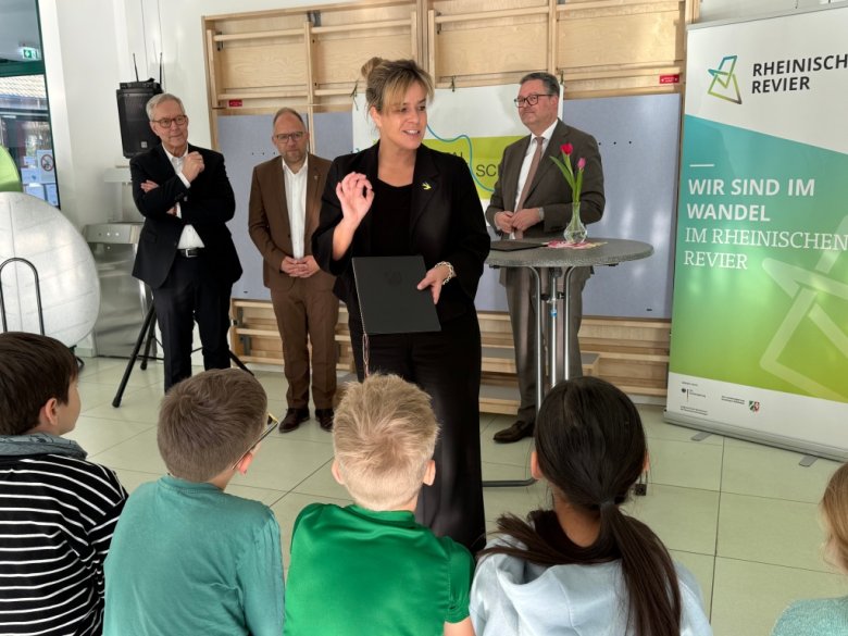 Ein wichtiger Termin fand heute Morgen in der Wurmtalschule in Scherberg statt. Gespannt hatte das Schülerparlament zusammen mit Schulleiterin Ulla Pabich die Ankunft von Ministerin Mona Neubaur erwartet. Sie war gemeinsam mit Regierungspräsident Gregor Lange nach Würselen gekommen, um Bürgermeister Roger Nießen den erhofften Förderbescheid persönlich zu überreichen.